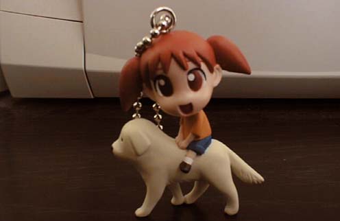 | 2001/2/22公開。なんだか秋葉原あたりでは再販してもなおかつ品切れ状態らしい人気アイテム、ガシャポン・キーホルダーの「すいんぐあずまんが」より、ただきちさんの背中にまたがるちよちゃん(笑)。このシリーズはご覧の通りキャラクターが2頭身な上に、キーホルダー用のチェーンが着いているので、重心が高い&アンバランスで他のキャラクターは全然自立しないんですけど、ちよちゃんだけは4本足(笑)なのでご覧の通り自立できます(笑)。しかし大きさのわりにできのいいこと(笑)。 |