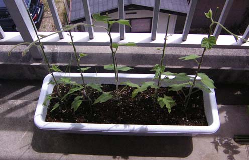 2002/7/13公開。朝顔日記(笑)、ということで(笑)、現在たこい家のベランダで育っている朝顔。この写真は7/6朝の撮影。ずいぶんつるが伸びてきました。