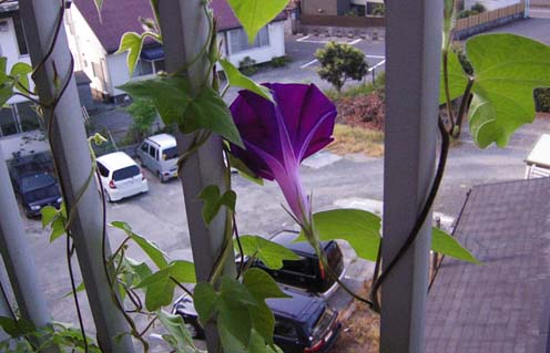 2002/8/5公開。朝顔日記(笑)の更新。現在たこい家のベランダで育っている朝顔。この写真は7/30朝の撮影。この日、初めて花が咲きました。