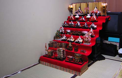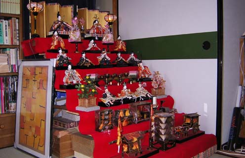 | 2003/3/3公開。たこい家のひな人形2003年ヴァージョン。普段は物置状態(笑)の書庫部屋に飾っているんだけど、毎年どういう配置で置くか思案のしどころ(笑)。 |