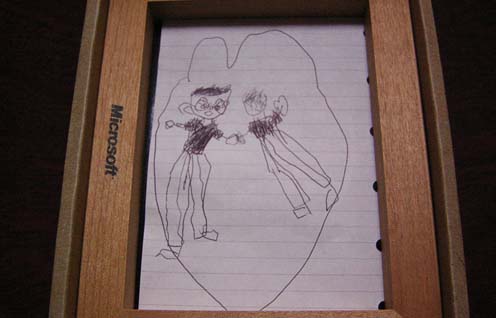 2003/4/14公開。たこい夫妻結婚の遠因(?)となった沢村家ご一家と仙台で食事などした時に、下の娘さんが描いてくれたたこい夫妻の図(笑)。飾っているフレームが某社のロゴ入りなのはご愛敬(笑)。たこいの妻の昔の仕事がCADソフトのインストラクターとかだったので、この手のグッズは外にもいろいろあります(笑)。Sunのバンダナとか(笑)。