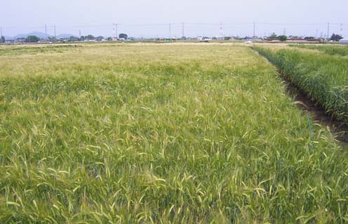 2003/6/15公開。5月下旬の某所の麦畑。ふさふさと実っています。
