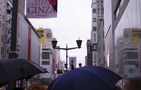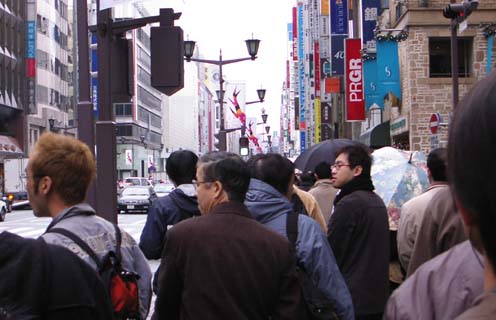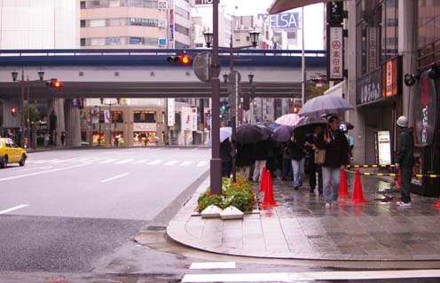 | たまたま用事で東京に来ている日にアップルストアの初日が重なるというのは、何かの運命(笑)かと思い、出かけてみました(笑)。 9時ちょっと過ぎに地下鉄で店の前まで来てみたところ、朝からの大雨にもかかわらず、既に大行列が(笑)。ともあれ、とりあえずは行列の最後尾を目指しててくてく歩く(笑)。で、我々が並んだのは京橋(笑)。同様に行列にそって歩いてくる人たちがぞろぞろ歩いてくる光景。 |