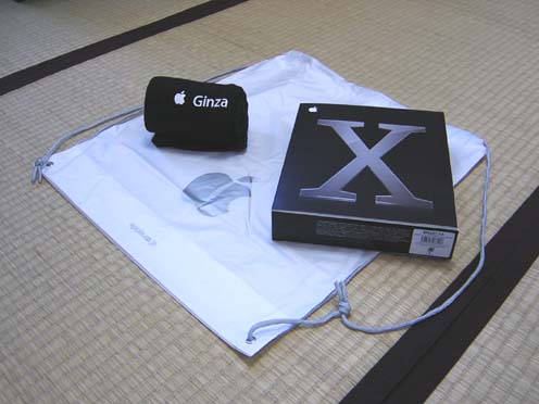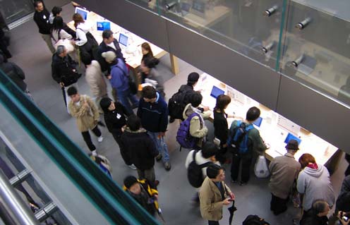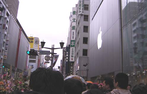 | 2003/12/07公開。11/30グランドオープンのアップルストア銀座店のオープン当日の一コマ。10時オープンに9時ちょっと過ぎから並んで雨の中3時間待ちました(笑)。 因みに、これは入店する直前、店の前に並んだ花束がちょっとだけ見えます。 |