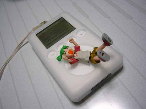 2004/05/09公開。引き続きのネタというかなんというか(笑)、先日職場の同期から買い取ったたこいのiPod(笑)。電撃大王6月号付録の完全可動よつばちゃんフィギュアをあしらってみました(笑)。