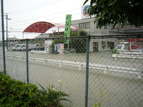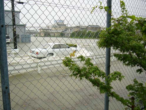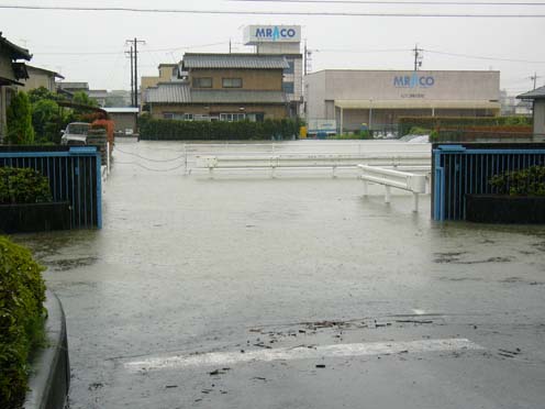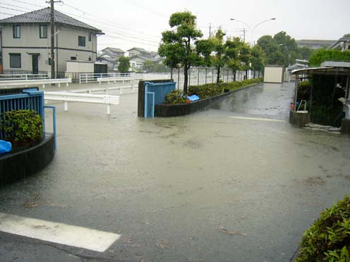 | 2004/07/25公開。6/30に静岡地区を襲った豪雨の被害状況など。職場の敷地は周囲よりやや高めになっていたので、建物への浸水被害などはなかったんですが、入り口の警備室まで水が押し寄せてこんな感じ。因みに、写真はないけど、住んでいる社宅の方は、社宅本体は辛うじて床下浸水レベルですみましたが、物置が30〜40cmほど水没したので、その後の片付けにはそれなりに苦労させられました。まあ、新潟、福井の方々の前では偉そうなことはいえませんけど。 |