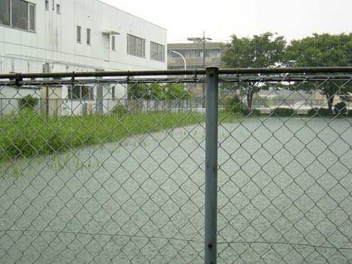 | こちらは職場の敷地内で「調整池」と普段呼ばれているスペース。その真の機能が発揮されているという姿は、初めて見ました。 |