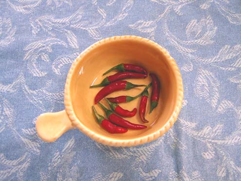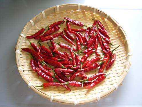 | 2004/08/22公開。たこい家ベランダ菜園の収穫物。普通の食用の唐辛子の種を昨年植えておいたのが、今年になって大豊作(笑)。これは第1弾で、収穫後にさらに花が咲いて唐辛子がどんどん出来てます。しかし、唐辛子ばかりこんなに穫れてどうする(笑)? |