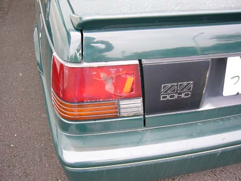 | 2004/10/24公開。台風22号の傷痕。暴風がまともに当たる方向に向いていたクルマのテールランプに飛んで来た何かがぶつかったらしく、ご覧の通りの有様。古いクルマだから交換パーツがちゃんとあるかちょっと心配。まあ、伊豆の方々の前では偉そうなことはいえませんけど。 |