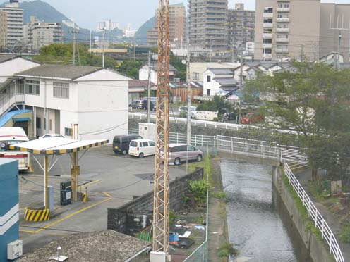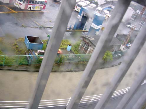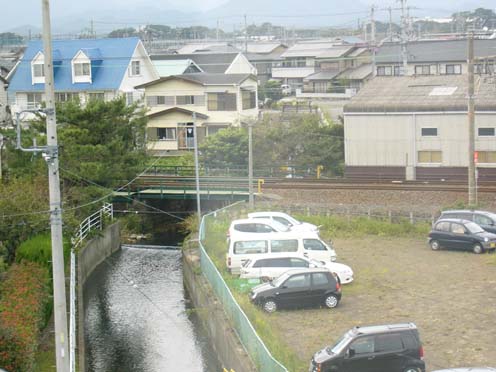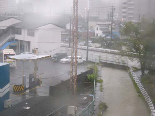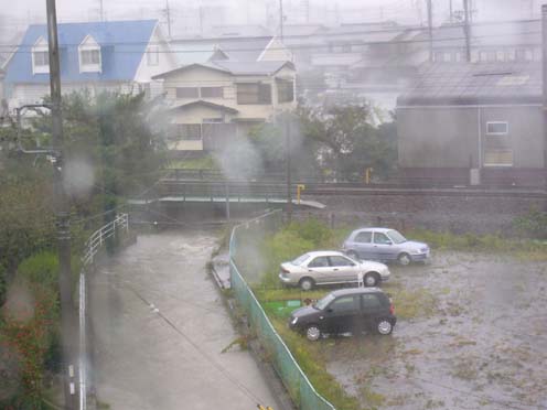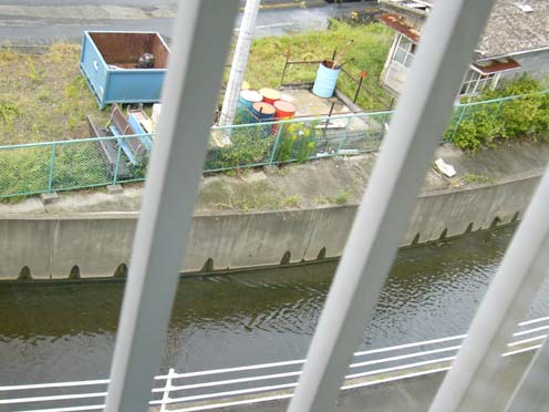 | こちらはまあ、当日の社宅の窓からの眺め。例によって、ほぼ同じ構図で後日晴れてから撮影した写真とペアにしてあります。 この窓がクルマのテールランプと、風に対する向きが一緒だったんですけど、いつ割れてもおかしくないくらいがたがた風で揺るられるわ、サッシが老朽化しているので隙間からじゃんじゃん水は入ってくるわ(サッシのレールが川になってました(笑))、何かものが飛んで来てガラスが割れていたら、と思うとちょっと怖い。 窓から見える水路がひたひたで今にも溢れんばかりですが、この水路が6/30には溢れて、床下浸水というか、物置に浸水してえらいことになったんでした。 |