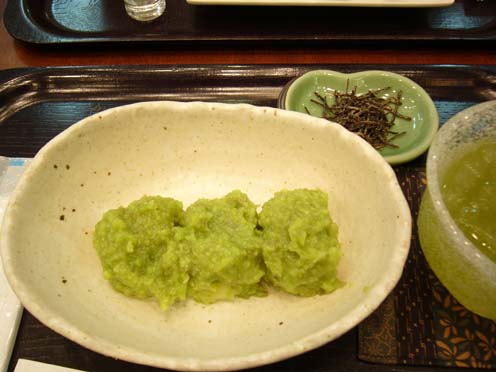 | あと、これは仙台駅のずんだ喫茶(?)のずんだ餅。宮城県ではスーパーなどで売っている普通の串だんごにもずんだと胡麻あんがデフォルトです。静岡で暮らし始めたばかりの頃、緑色のあんののっただんごを買ったらずんだじゃなくてうぐいすあんだったのでものすごくがっかりしたことが……(笑)。 |