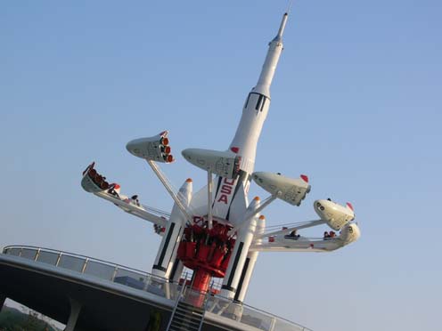 | 入場してすぐ、スペースマウンテンの次に乗ったスタージェット。遊具としての構造は回転木馬に近いんだけど、本体をぐっと高い位置におくことで飛行機で飛んでいるような気分を味わえる……んだけど(笑)、スペースマウンテンで三半規管をぐるぐるにされたすぐ後に乗ったので、けっこう脳味噌がぐるぐるしました(笑)。ジェット機のパイロットとか宇宙飛行士とかには体質的に向いていないかも(笑)。 |