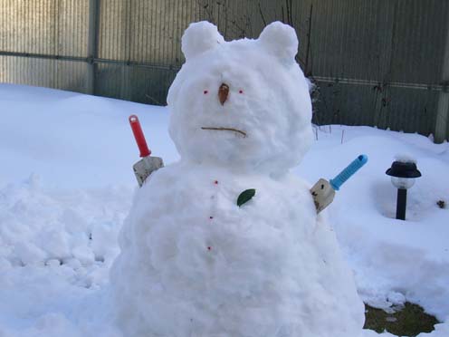 で、こちらは作った翌日。ちょっと溶けて目鼻が落ちてきたので、化粧直し(笑)。ついでにくまの耳をつけてみました(笑)。