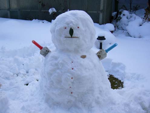 2005/01/10公開。正月にたこいの実家の庭で作った夫婦合作雪だるま(笑)。まあ、けっこうかあいくできたでしょ(笑)?