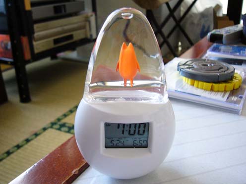 | 2005/05/24公開。久しぶりのちよ父ネタですが、通販で買ったアクアクロック。買う前に想像していた以上によくできていてちょっと感動(笑)。中のちよ父がファスナーマスコット版とほぼ同じ形状&大きさ(材質は当然ながら全然違うはずだが(笑))なのもポイント高し。 |