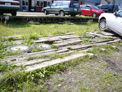 | まあ、こんな感じで駐車場がわりになっていたり、使いやすいようにタイヤとか枕木でレールを埋めてあったり……。 |