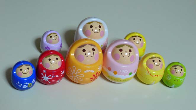 | いや、ほんものとにせもの、とかいうと「どっちもほんものだ」とか妻からいわれそうですが(笑)、上の写真で顔がちょっと上を向いているのはガチャガチャで売られているマトリョーシカうなずきんというにせもので、中に小さいうなずきんが入れ子で入っています(笑)。全部ならべるとこんな感じでそれなりに壮観(笑)。 因みにほんもののうなずきんは音とか声に反応して首を縦に振ったり横に振ったりします。シリーズもので次々と新しいヴァージョンが出ているらしいぞ(笑)。 |
