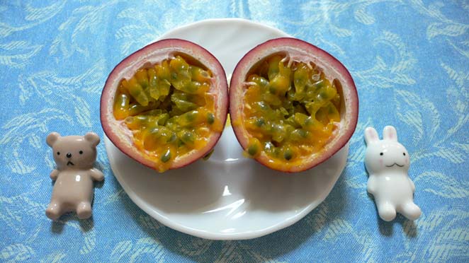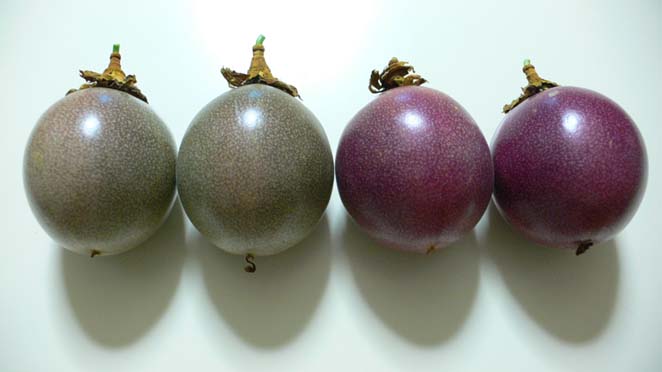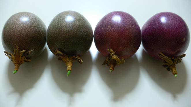 | 2006/12/29公開。行きつけの農園でもぎ取ってきたパッションフルーツ。もぎ取った後、しばらくおいて色が赤くなって香りが強くなってきたら食べ頃。 |