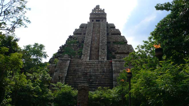 | こちらはインディ・ジョーンズのパビリオン。第1作の冒頭の丸い岩に追っかけられるシークエンスを再現しているという触れ込みだったので、どうやってるんだろう、と思ったのだが、なかなかびっくりしました。 |