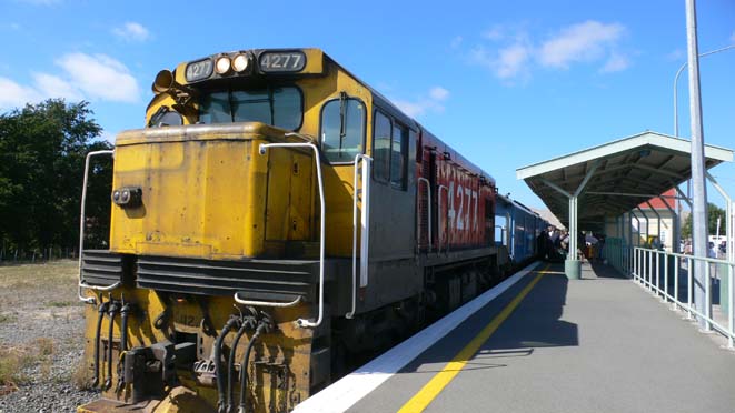| 2010/12/31公開。引き続き3月のニュージーランド旅行シリーズ。ニュージーランドの観光鉄道トランツコースタル号。もともとは普通の鉄道で、一度は運行をやめていたものを、現在は観光客向けに一日一往復だけ運行させているとか。これは目的地のブレナムに到着したところで撮影したもの。 |