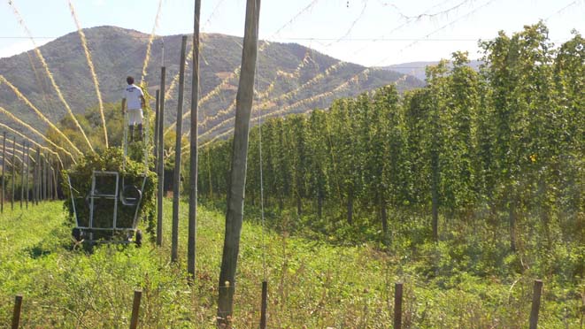 | ちょっとおまけ。帰路でみつけたホップ収穫風景。ニュージーランドのホップはこの近辺で栽培されてます。 |
