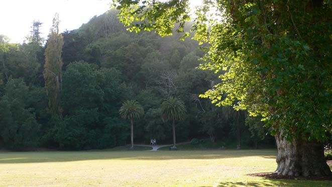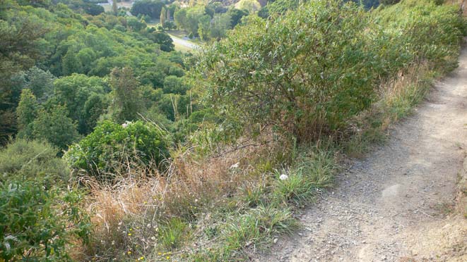 | 宿泊しているネルソンにこういうものがある、というのは、トレッキングのガイドさんに教えてもらって、朝のおさんぽのつもりで出かけてみたんだけど、登り口はこんな感じ。小高い丘、というよりはちょっとした小山。 |