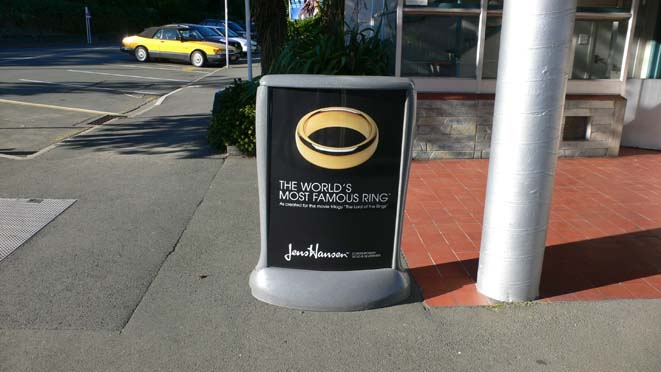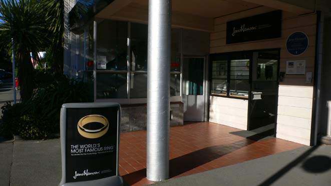 2013/12/14公開。引き続きニュージーランド旅行。こちらの写真はネルソンで宿泊したホテルの角の宝飾店の店頭の看板。どうも撮影用の「一つの指輪」を作った宝飾店らしく、レプリカの販売を承ります、との由。