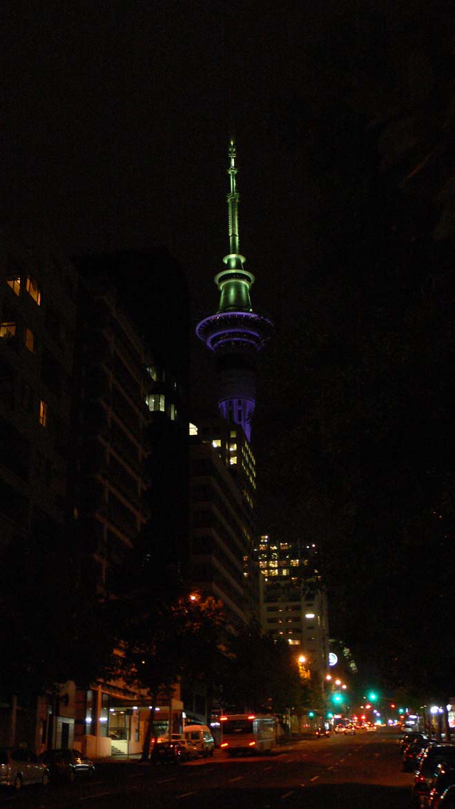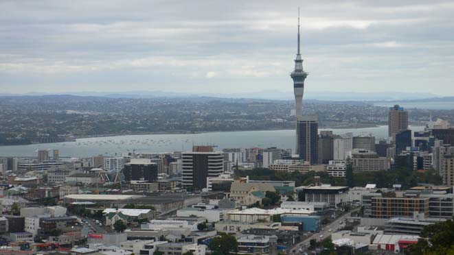 | 前回紹介の博物館の後、小高い丘から見下ろしたオークランドの街。この特徴的なタワーはTVとかでもよく出てきますね。あと、街中にバンジージャンプ設備があったりするのがオークランド品質(笑)。 |