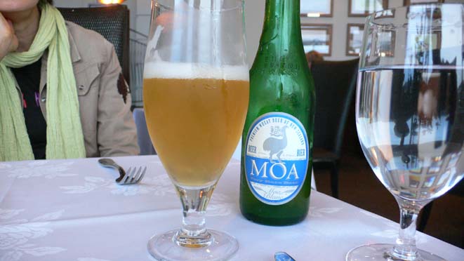 | マールボロのワイナリーツアーの途中で立ち寄ったMOAビールがメニューにあったので頼んでみました。ベルジャンホワイトタイプでなかなかよかった。 |