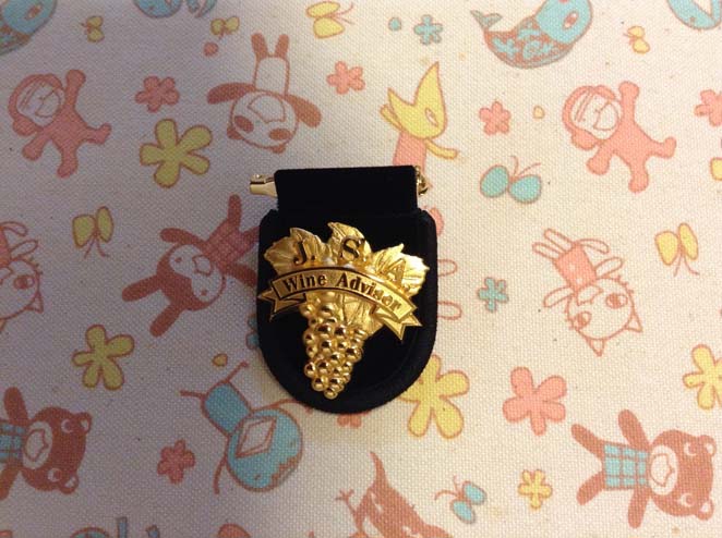 | 同じく年賀状に使った(財)日本ソムリエ協会のアインアドバイザーバッヂ。ほぼ丸一年の猛勉強の成果。まあ、これをつけてどこかに行く機会はないと思いますが、これ以外に、資格者用のプラスチックのカードもあります。 |