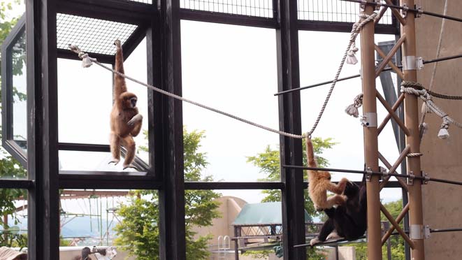 | こちらはチンパンジー舎。写真だとわかりにくいですが、夫婦が赤ちゃんにかかりきりになっているところで、かまってほしいオーラでじゃれつく子供チンパンジーの図。やることは人間とあまり変わらないですね。 |