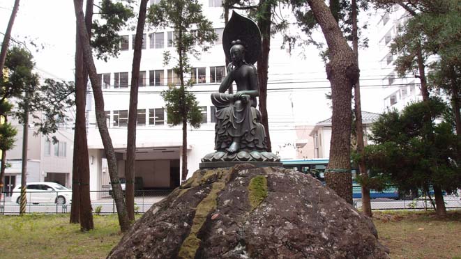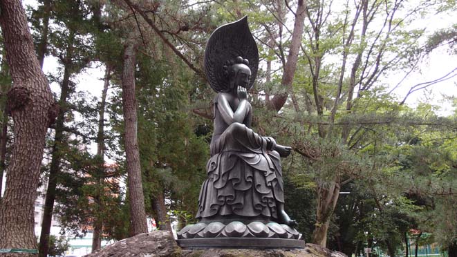 | 学部に通い始めて初めて見つけた時の衝撃は言葉では表せなかった(ある意味、『暗黒神話』のラストを体感したような(笑))ですが、学部内では「粟野観音」と呼ばれている弥勒半跏思惟像。大昔の教授の名前にちなんでいるようです。 |