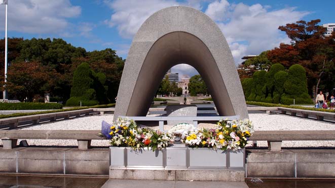 | 原爆死没者慰霊碑。この後平和記念資料館に行ったところ、記念館の周辺が発掘調査中で、見学修了後に見下ろすと埋められていたいろいろなものが見えました。このあたりで人々が生活していたことを意外な形で実感。 |