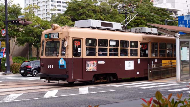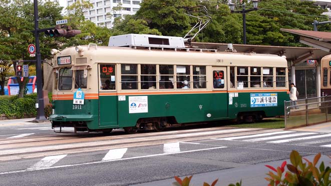 | こちらもやや古いタイプの車両ですが、これは元京都市電とのこと。1911号は「祇園」と呼ばれているようです。 |