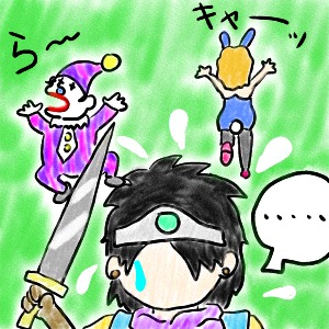 旅人の扉へ向かう途中の段階で、全員ともレベル9という急成長ぶり。遊び人3人は亀の甲羅を装備し、最強の防御力で無駄な行動を繰り返している。(えー)