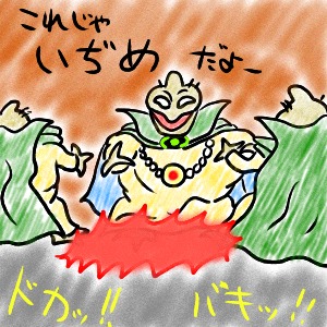 ゆたんぽのいやな予感は見事に適中した。むかつくカニ野郎のスクルト攻撃、グレーの巨人のバイキルト攻撃、そしてバラモスブロス(バラモスエビル?)3人組(悪魔のかしまし娘ともいう)の情け容赦無い火炎&呪文攻撃....。あっという間に全滅じゃー。