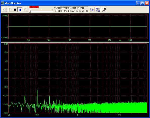Lchノイズフロア。やはりAC電源、ハムが50、100,150Hzと少し出ているが、音を聞いてもほとんど確認できず。全体的に、極めてノイズが低い。ハムを除けば、130dBを全帯域で切る。