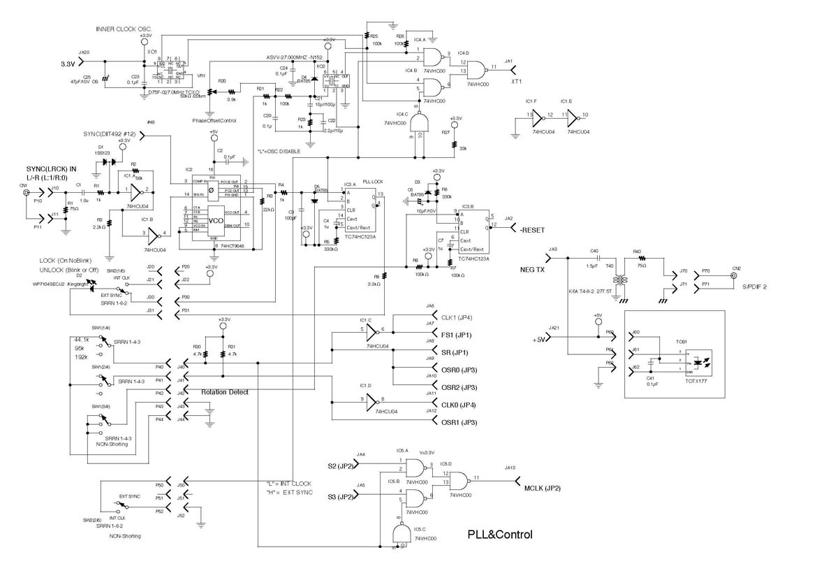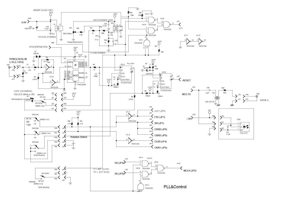 ADCのL/Rクロック(DITのSYNC)と、外部から入ってくるSYNC信号とをフェーズ・ディテクタで比較検出して、出力にループフィルタを入れて、27MHzのVCXOの周波数をコントロールする。その出力がPLL1707に入る。つまり、PLL1707のPLLと併せ、『二重PLL』となる。