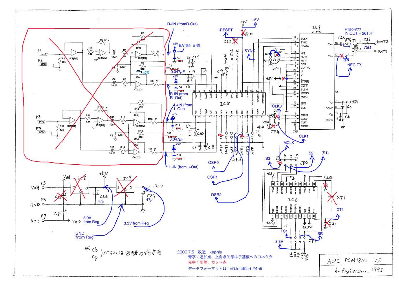 fujiwara氏のADC-PCM1804回路図の改造点。fujiwara氏転載許可済み。青が追加、赤が削除・カット。「図面を表示」で大きくなる。