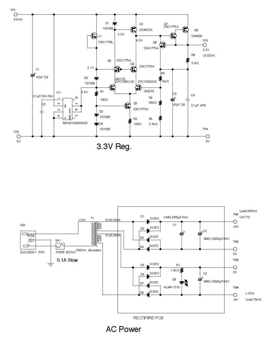 5.0Vレギュレータは金田氏の回路そのままである。3.3Vレギュレータは、できるだけローノイズにしたい。VCXOは電源電圧の変動が周波数変調に出やすい。以前使用したMAX6325シリーズは埋込ツェナでノイズが低いが、電源電圧が8V以上と、場合によってはぎりぎり、若干足りない可能性もあるのでこれは使用できない。そこでMAX6126シリーズを用いることにする。デジキーで(今のところ)購入可能。MAXIMからサンプルで2個ならもらうことができる。0.1Hzから10Hzのノイズはこちらの方が低いようだ。MAX6126は2.048Vと2.5V、5.0Vがあり、2.048Vではぎりぎり一部のTrのバイアス電圧が足りなくなる、5.0Vは電圧が高すぎ、ということで2.5Vを使用した。カスケードのTrのバイアス電圧が金田氏設計より若干低くなるが動作範囲である。