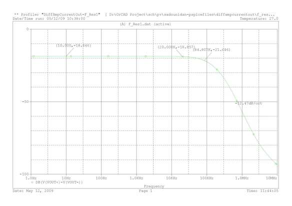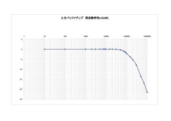 差動の周波数特性である。前段の反転バッファ込み。実際のカットオフ周波数は、110〜120kHz辺りである。シミュレーション通りには行かない。20kHzまではフラットである。問題がないと思われる。この値で使用することとする。