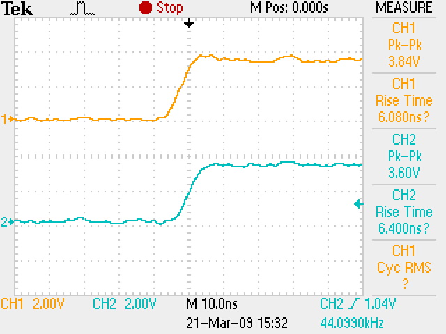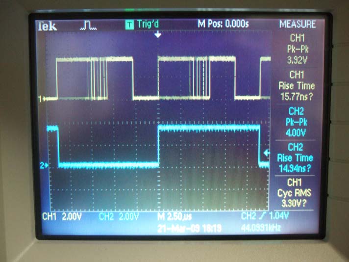 まず、この写真で、LRCKの立ち上がり・立ち下がりに対して左詰めで揃っているので、これは、少なくともStandard Formatではないことがわかる。上図、写真にしたのは、安物のオシロなのでワンデータ毎の書き換えで表示され、シリアルデータが流れている様子を感覚的に見るには写真の方が判りやすかったためだ。最新のディジタルオシロだと、こういった波形も見やすくなるが、高いので買えない。
