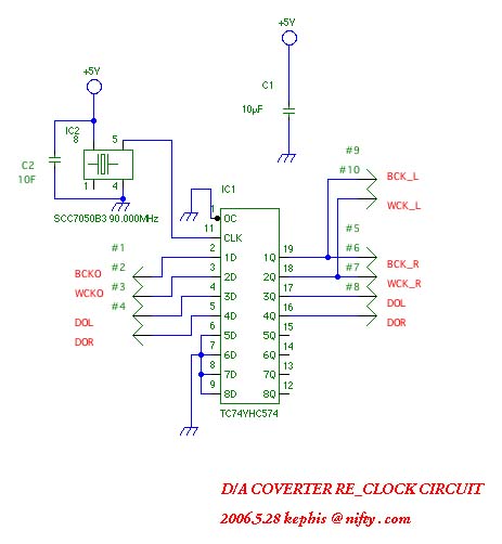 クロック周波数は90MHz。fujiwara氏によると、48MHzでもリクロックが動作した、ということだが、これは48kサンプリングの場合のようである。96kサンプリングにすると速度が追従できないので、VHCシリーズのロジックと90MHzのクロックとした。