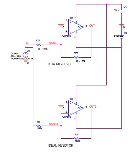 では本当かどうか、理想抵抗と図1で表1の3216(KOA RK73H2B相当)の場合とで、アンプの帰還抵抗に使って比較してみましょう。