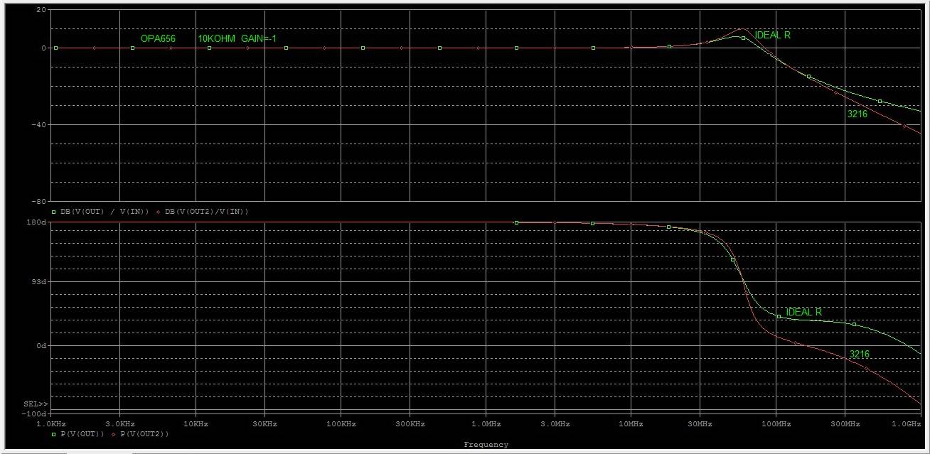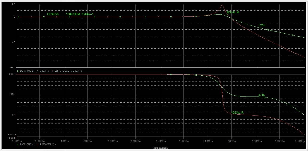 OPA656というかなりGB積の大きなオペアンプモデルを用いてみました。高周波までシミュレーションできるからです。10kΩと100kΩとの場合での同じ回路で比較を行ってみました。