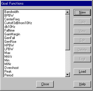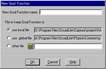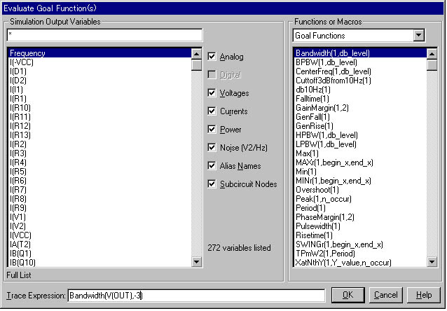これらの関数を組み込むには、PSPICE A/Dの[Trace]メニューのなかの[Goal Functions...]を選択すると、下図のようなウィンドウが出てきます。