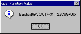 上記は、「Bandwidth」という関数を実行するコマンドで、波形の中のV(OUT)に関して、”-3dB”計算での帯域幅を求め、その結果は2.2038*10^5[Hz]です、という結果が得られている様子です。