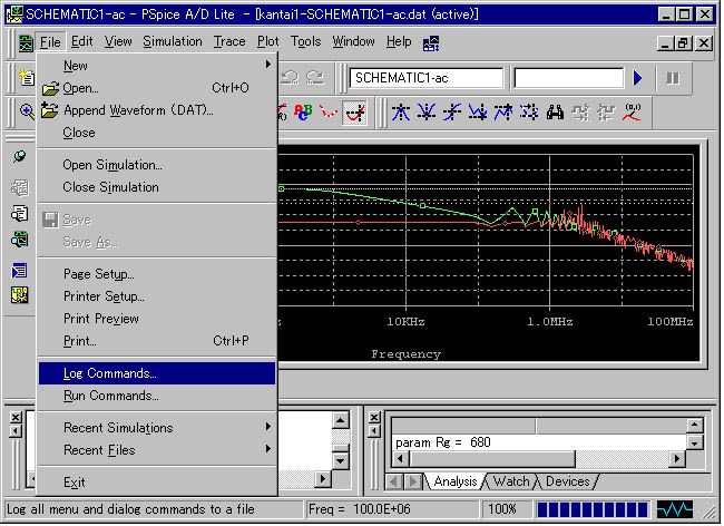PSpiceA/Dで、上記の様にシミュレーションをやるたびに、毎回グラフ表示のセッティングをしなければならないという事に対して、もう一つ解決策があります。それは、マクロです。[File]メニューの[Log Commands...]を選ぶと、その時点からの操作がマクロバッファに記録されます。したがって、マクロを記録したい操作の直前に[Log Commands...]を選び、その操作を行い、一通りの操作終了後に再度[Log Commands...]を選びます。すると、マクロ記述ファイルの保存が行われるためにファイル名と保存場所を尋ねてきますので、適当な場所(普通はカレントのシミュレーションが入っているフォルダ)に、適宜の名前を付けて保存します。マクロ記録中は[Log Commands...]の左端にチェックマークが出ます。