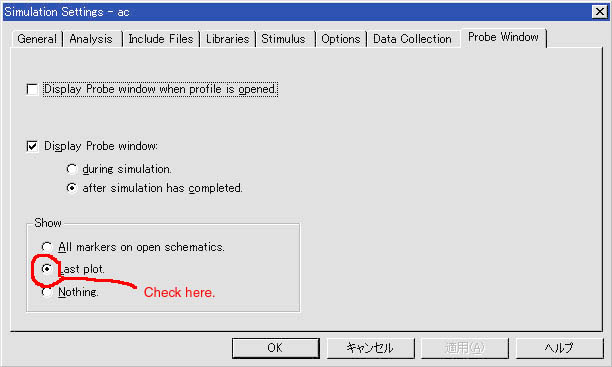 PSpiceA/Dでグラフを表示する機能はいろいろありますよね。グラフを分割したり、たくさんの表示を複雑にしても、シミュレーションを再スタートすると、デフォルトでは毎回毎回、一から表示の設定をやり直さなければなりません。ですが、Simulation Settingsのコマンドで、ウィンドウの一番右のタブ[Probe Window]をクリックしてみましょう。このタブに出てくる[Show]の中から、[LastPlot]のボタンをクリックしておいてシミュレーションを行うと、PSpiceA/Dのグラフ表示の設定は直前の状態が保持された状態でグラフを表示するようになります。これは、アプリケーションを終了して再度立ち上げた時にも有効です。