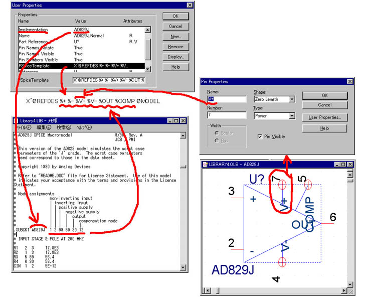 左上はライブラリの[User Properties]、左下はダウンロードしてきたAD829Jのモデル、右中は[Pin Properties]、右下はライブラリエディタで編集中のシンボルで、ここで各ピンをダブルクリックすればそのピンの[Pin Properties]が開きます。